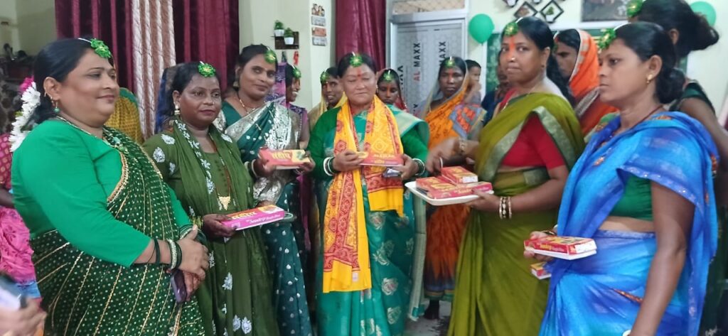 हेमंती जयसवाल ने सुहागिनों को चूड़ी सिंदूर भेंट कर सावन की बधाई दी।